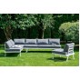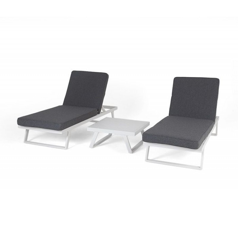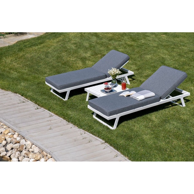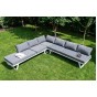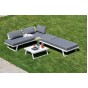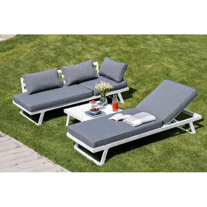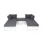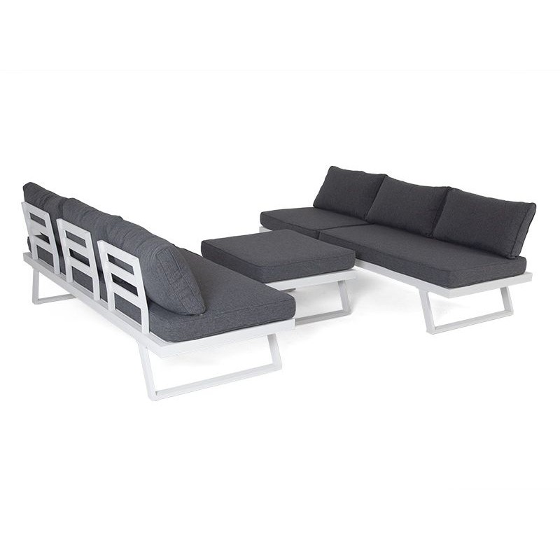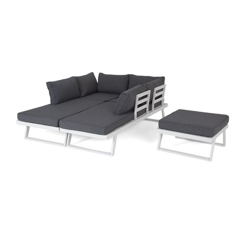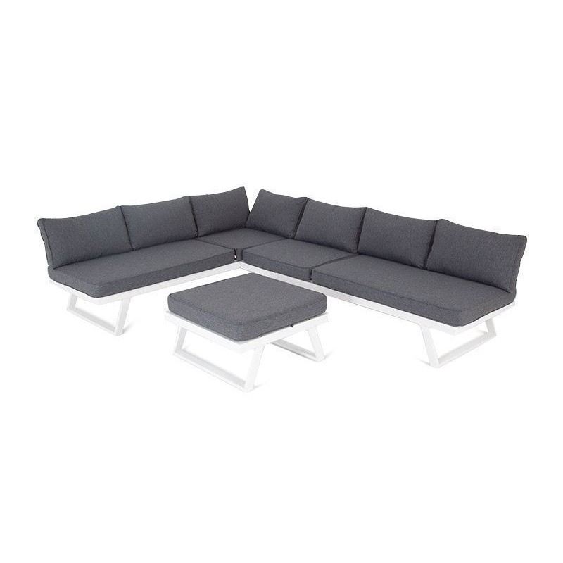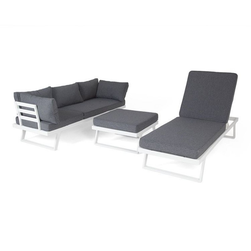 Трансформирующийся комплект «Альпы» преобразуется в 6 различных модификаций. Облегченный алюминиевый каркас белого цвета, подушки с влагоотталкивающей пропиткой и съемными чехлами серого цвета. В состав комплекта входит: – два прямоугольных модуля, которые трансформируются в шезлонги – один квадратный модуль с возможностью трансформации в три изделия (столик, оттоманка и кресло) – семь съемных спинок