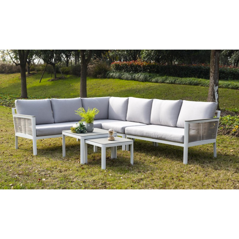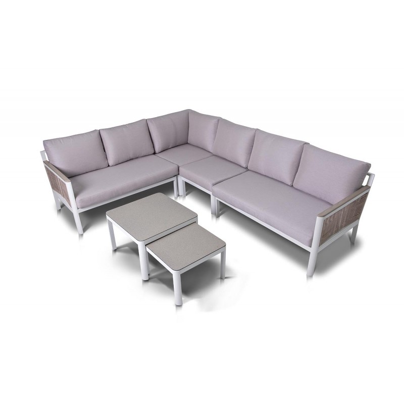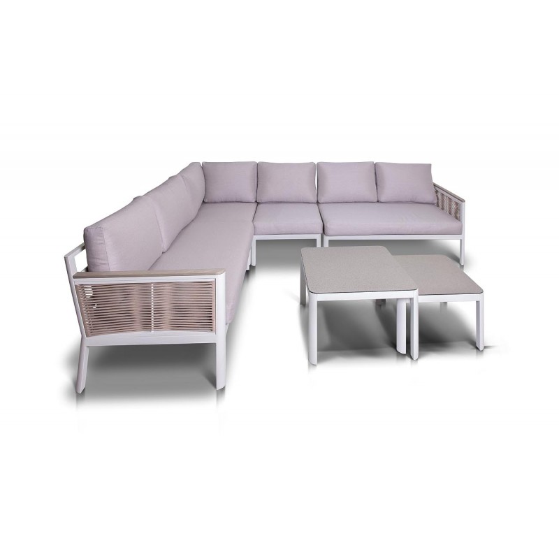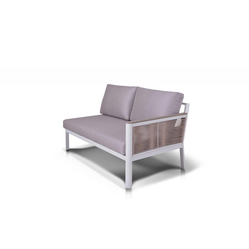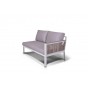 Диван можно трансформировать под нужный размер и расположение. Состоит из алюминиевого каркаса белого цвета, который дополняет бежевая оплетка из эластичных синтетических лент, состоящих из высокопрочных полиэфирных волокон.