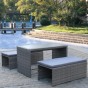 В составе комплекта: диван, который трансформируется в обеденную группу: стол, лавочка и 2 пуфа. Высококачественная лоза из полиротанга серого цвета стойкая к любым атмосферным явлениям. Крепкий стальной каркас с полимерным антивандальным покрытием и отличным качеством сварки. Изделие сплетено вручную нашими мастерами под жестким контролем качества на каждом этапе производства. Лоза максимально приближена по рельефу и текстуре к естественному материалу. Идеально подходит для использования на улице и внутри помещения в любую погоду. Не боится воды, солнца и минусовой температуры. Подушки входят в комплект. Оттенки цвета на фото могут отличаться от представленного образца. Декинг на столешнице светло-коричневого оттенка.