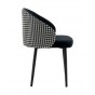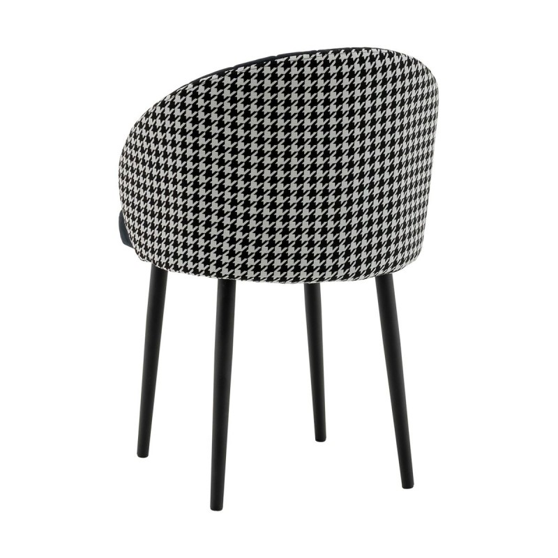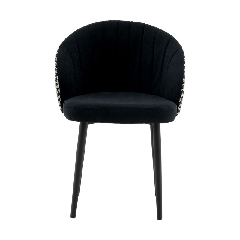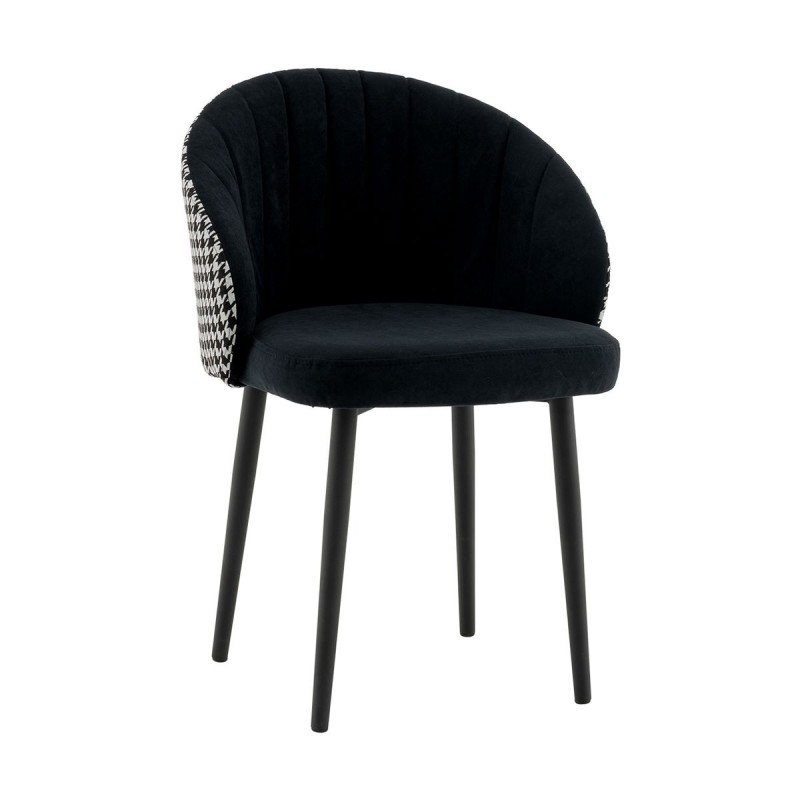 Стул обеденный Пасаденика сразу привлекает внимание своим стильным контрастом. Мягкая обивка из чёрного велюра придаёт модели глубокий насыщенный цвет и благородную фактуру, а оригинальная отделка спинки с рисунком «гусиная лапка» добавляет модный, дизайнерский штрих и делает образ завершённым. Округлая форма спинки с мягкими вертикальными простёжками поддерживает спину и обеспечивает удобную посадку даже при длительном использовании. Прочные металлические ножки в чёрном цвете гарантируют надёжность и устойчивость конструкции, сохраняя при этом изящный силуэт. Стул для кухни Пасаденика органично впишется в современные, лофт и эклектичные интерьеры, станет эффектным решением для столовой зоны, кафе или гостиной. Это не просто функциональная мебель, а выразительный элемент декора, который подчеркнёт характер вашего пространства.
