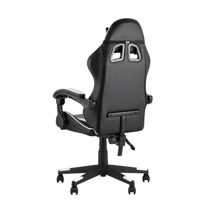 Кресло укомплектовано ортопедическими подушками для поддержки шеи и пояса, каждая из которых может быть настроена так, как вам захочется. Механизм регулировки угла наклона спинки с фиксацией и глубокая посадка сиденья позволяют максимально комфортно расположиться в кресле. Мягкие PU-подлокотники добавляют еще больше уюта. Колесики из полиуретана бесшумно передвигаются и не повреждают напольное покрытие.
