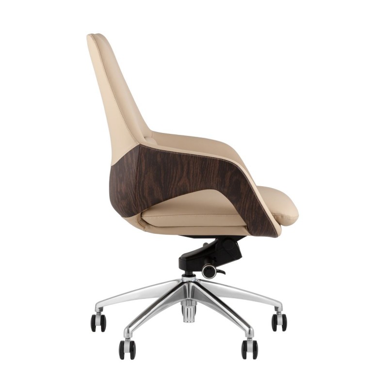 Кресло офисное TopChairs Reign элегантность и надежность для современного интерьера.Материалы и цвета.Кресло выполнено из высококачественной экокожи бежевого цвета, которая придает модели солидный и стильный вид. Спинка снаружи декорирована узором под дерево, добавляя уникальности и изысканности дизайну. Крестовина изготовлена из прочного алюминия, что гарантирует устойчивость и долговечность.Дизайн.Эргономичная форма спинки и сиденья обеспечивает комфорт во время длительной работы. Плавные линии и отсутствие лишних элементов подчеркивают современный стиль кресла. Подлокотники интегрированы в конструкцию, гармонично дополняя общий внешний вид.Функциональность.Механизм качания мультиблок позволяет регулировать угол наклона кресла и фиксировать его в удобном положении. Газ-лифт 4-го класса обеспечивает плавную регулировку высоты сиденья в диапазоне от 48 до 54 см. Кресло выдерживает нагрузку до 125 кг, а полиуретановые ролики с нейлоном обеспечивают плавное и бесшумное перемещение по любому типу покрытия.Место использования.Благодаря своему стильному и универсальному дизайну, кресло идеально подходит для использования дома, в офисе или рабочем кабинете. Оно органично впишется как в классический, так и в современный интерьер, обеспечивая комфорт и продуктивность.
