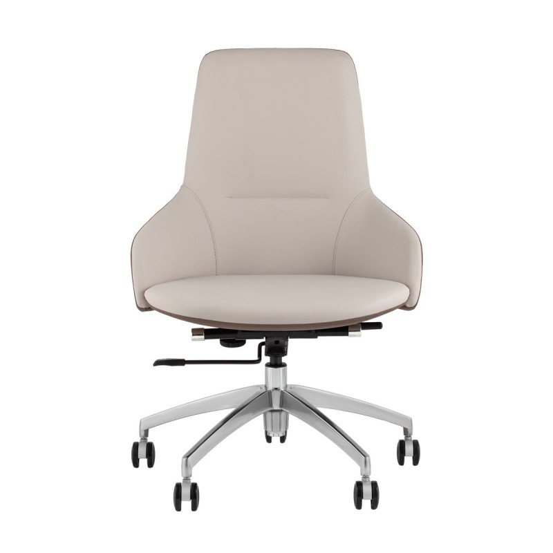 Кресло офисное TopChairs Soulo современное решение для рабочего пространства.Материалы и цвета.Кресло обтянуто прочной светло-серой экокожей, которая приятна на ощупь и легко чистится. Задняя часть спинки выполнена в контрастном коричневом оттенке, что придает модели современный и стильный вид. Крестовина из алюминия обеспечивает устойчивость и долговечность, а ролики из полиуретана и нейлона позволяют легко и бесшумно перемещаться по любым покрытиям пола.Дизайн.Лаконичные линии и минималистичная форма делают кресло универсальным и подходящим для любого современного интерьера. Высокая спинка поддерживает позвоночник, обеспечивая комфорт даже при длительном сидении. Широкое сиденье (57 см) с эргономичным контуром создает удобную посадку, а плавный изгиб подлокотников завершает эстетичный образ модели.Функциональность.Кресло оснащено мультиблок-механизмом качания, позволяющим адаптировать наклон для комфортного отдыха. Газ-лифт 4-го класса регулирует высоту сиденья от 47 до 53 см, позволяя настроить посадку под индивидуальные предпочтения. Подголовник и подлокотники не регулируются, что подчеркивает цельный и гармоничный дизайн.Место использования.Кресло идеально подходит для офисных рабочих зон, домашних кабинетов и современных переговорных комнат. Благодаря стильному внешнему виду и эргономичному дизайну оно гармонично впишется в интерьер и обеспечит комфорт на весь рабочий день.Максимальная нагрузка.Кресло выдерживает до 125 кг, гарантируя надежность и стабильность при повседневной эксплуатации.