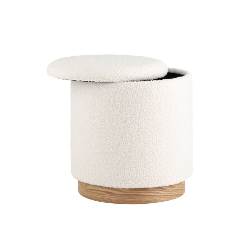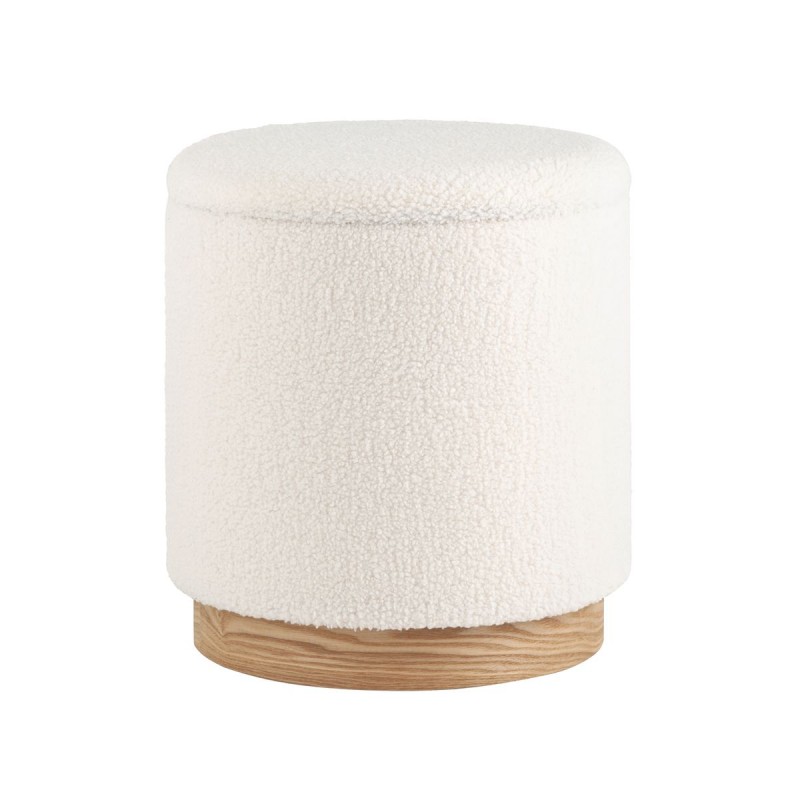 Лаконичный пуф в скандинавском стиле. Обивка выполнена из искусственного меха тедди - очень мягкий и приятный на ощупь материал. Прочный каркас из фанеры выдерживает на грузку до 150 кг. Основание из светлого массива дерева гармонично сочетается с белой обивкой. Пуф оснащен вместительным ящиком для хранения различный мелочей. Отличное функциональное дополнение для детской или спальни.