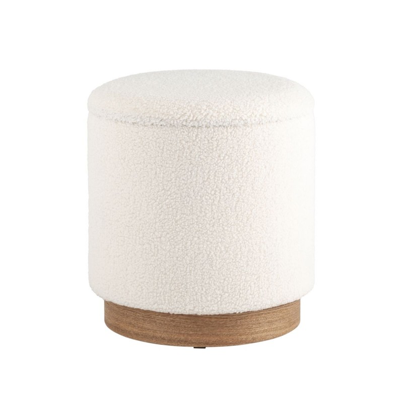 Лаконичный пуф в скандинавском стиле. Обивка выполнена из искусственного меха тедди - очень мягкий и приятный на ощупь материал. Прочный каркас из фанеры выдерживает на грузку до 150 кг. Основание из светлого массива дерева гармонично сочетается с белой обивкой. Пуф оснащен вместительным ящиком для хранения различный мелочей. Отличное функциональное дополнение для детской или спальни.