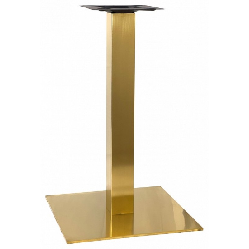 Подстолье из полированной нержавеющей стали (матовое). Цвет: золото (нитрит титана). Лаковое покрытие. Лаковое покрытие. Основание плоское. Размер верхней площадки: 25*25 см, сечение трубы 8х8 см. Рекомендуемый размер столешницы: Ø70, 70х70.