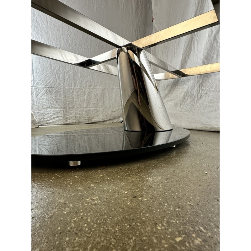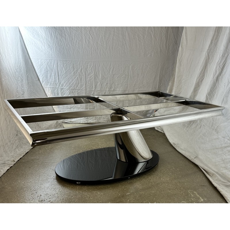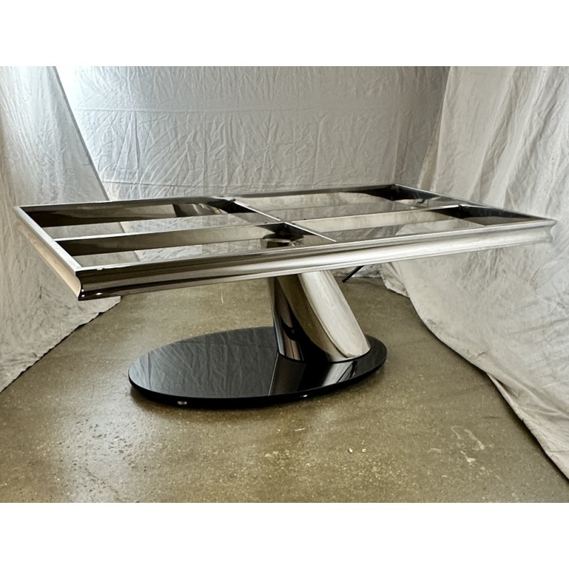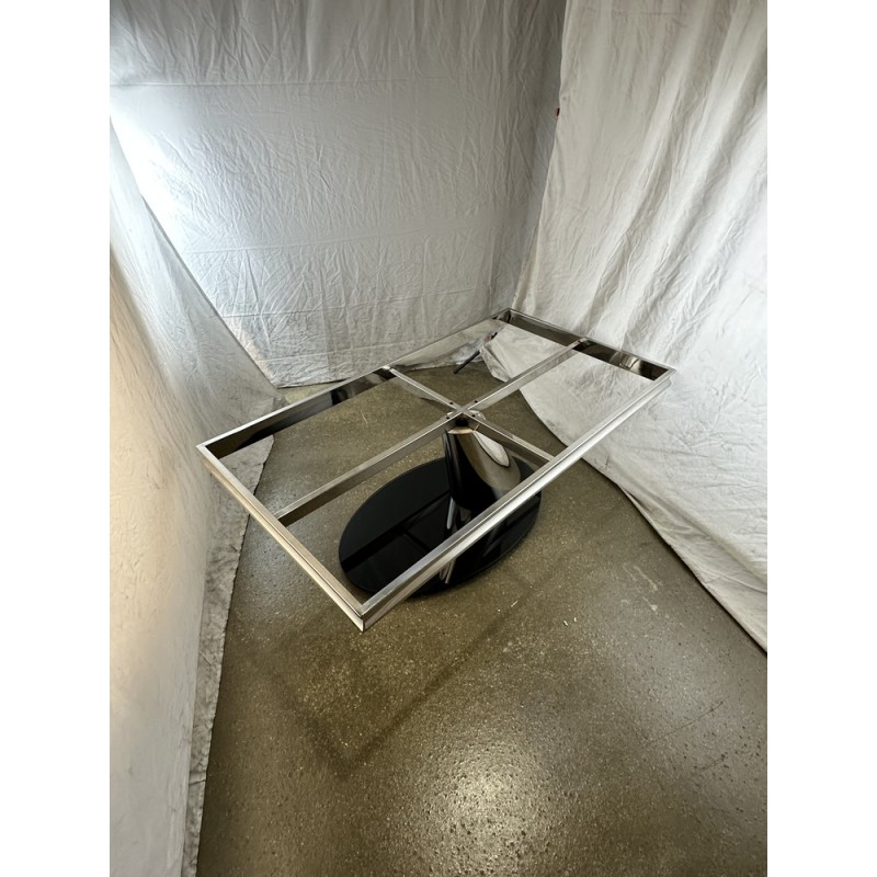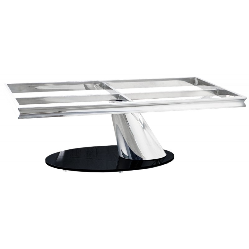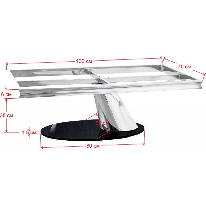 Журнальное подстолье из полированной нержавеющей (зеркальное) стали. В основании закаленное стекло толщиной 15 мм. Рама под столешницу размером 126х66.