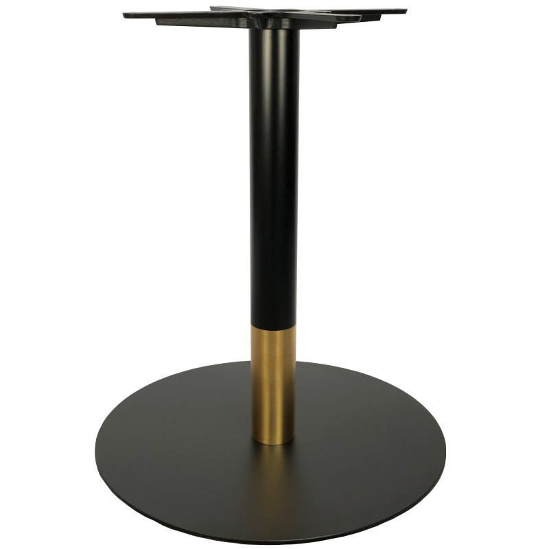 Подстолье металлическое. Труба и основание-черное порошковое покрытие матовое. Золотая вставка с матовой нержавейкой (нитрид титана). Основание плоское. Рекомендуемый размер столешницы: D-110.