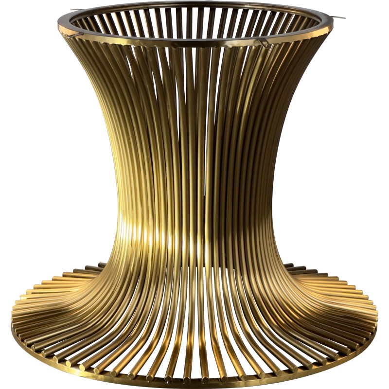 Подстолье из полированной нержавеющей стали, золотого цвета (нитрит титана). Лаковое покрытие. Диаметр верхней части: 65 см, нижней части: 90 см. Рекомендуемый размер столешницы: Ø220.