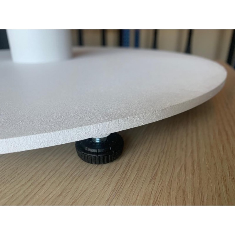 Комплектуется регулировочными ножками. Во-первых, они защищают пол от царапин, во-вторых, позволяют выровнять стол, если в помещении неидеальные полы