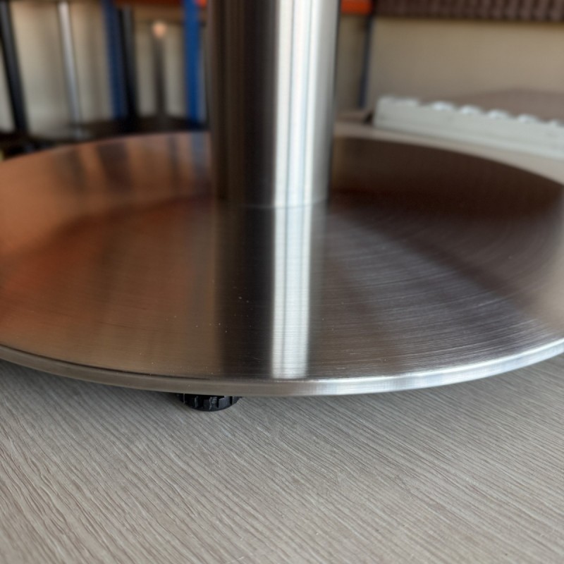 В отличие от подстолий с гальваническим покрытием, это подстолье более долговечно, а самое главное - выглядит намного эстетичнее. Ледяной блеск настоящей нержавеющей стали, матовый и благородный, переливается на свету. Выглядит, конечно, очень стильно, не сравнить с дешевым хромом.