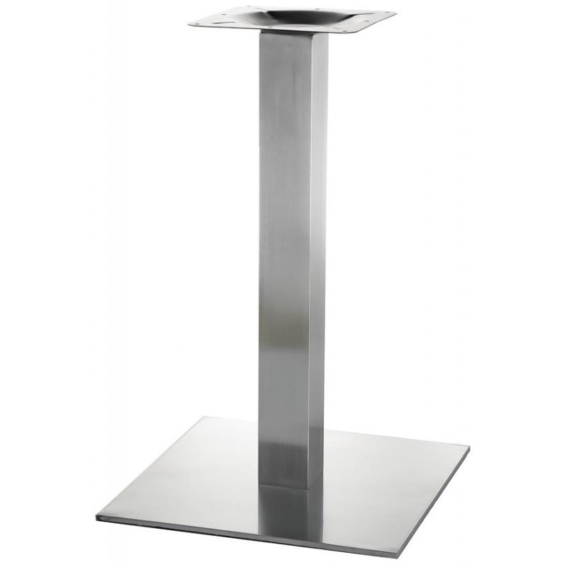 Подстолье из полированной нерживеющей стали (матовое). Основание плоское. Размер верхней площадки: 25*25 см, сечение трубы 8х8 см. Рекомендуемый размер столешницы: D-80, 80х80
