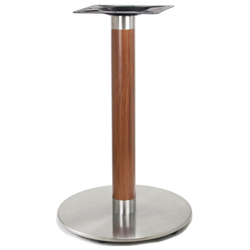 Подстолье из полированной нерживеющей стали (матовое). Труба лиминированная под текстуру дерева. Основание плоское. Размер верхней площадки: 25*25 см, диаметр трубы 7 см. Рекомендуемый размер столешницы: D-80, 80х80