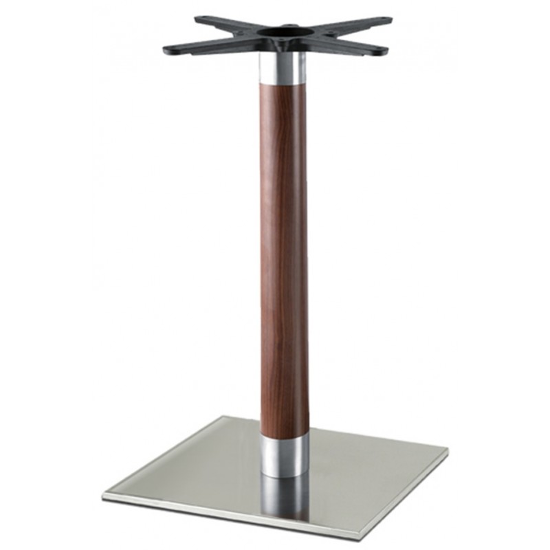 Подстолье из полированной нержавеющей стали (матовое). Труба ламинированная под текстуру дерева. Размер верхнего крепления: 25х25 см, трубы D7.6 см. Рекомендуемый размер столешницы: D-80, 80х80