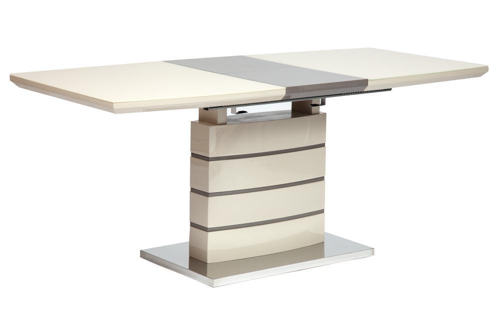 Стол раскладной, вставка "бабочка" хранится под столешницей. Материал МДФ high gloss, столешница покрыта закалённым стеклом. Цвет: ножка и столешница - слоновая кость; основание, дополнительная секция..