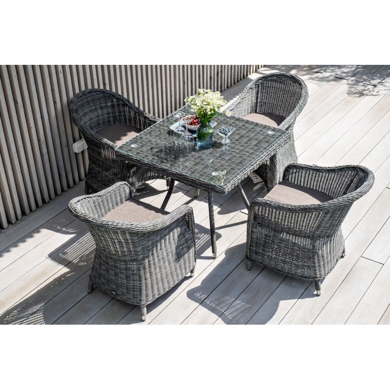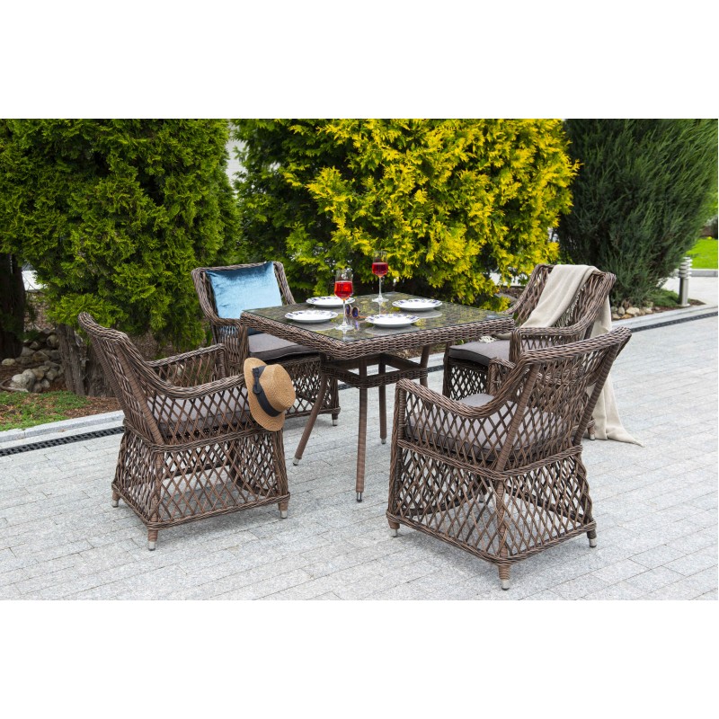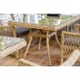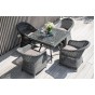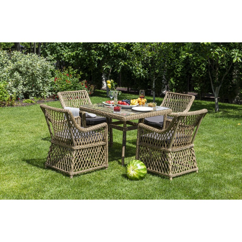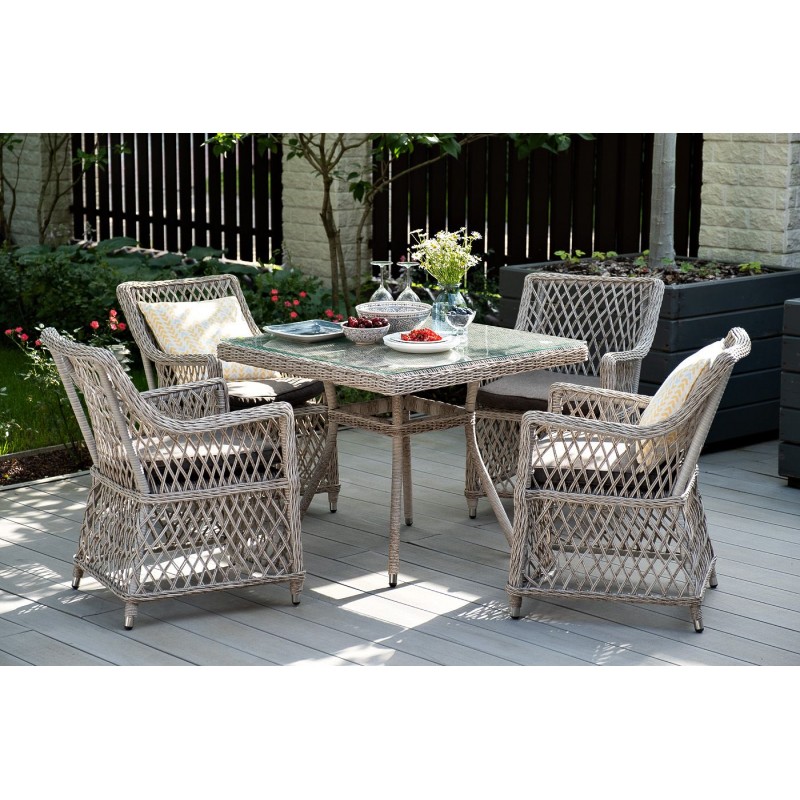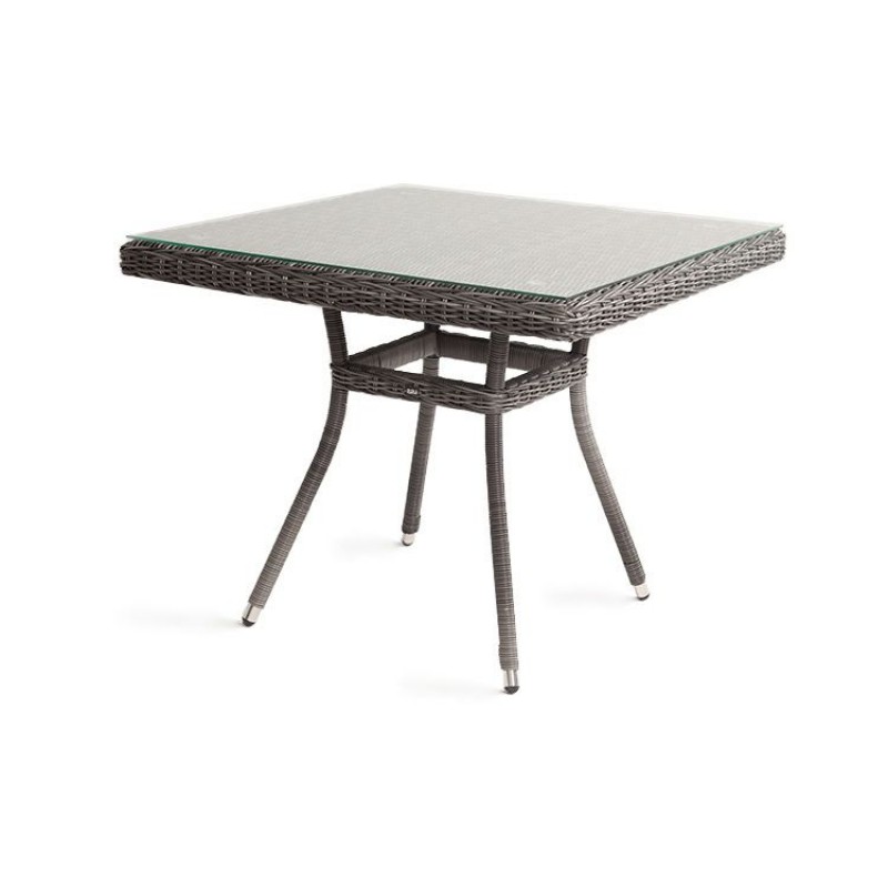 Благодаря столешнице из ударопрочного стекла толщиной 5мм, можно не опасаясь ставить горячую посуду. Каркас изготовлен из прочного алюминия, оплетенного ротангом графитового цвета.