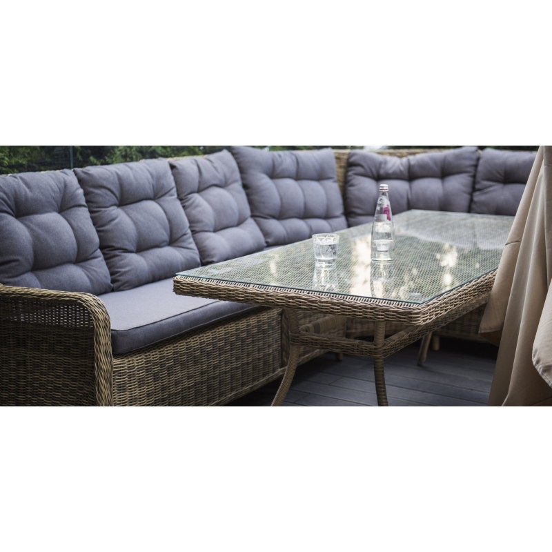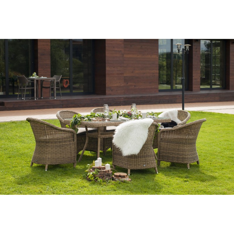 Материал устойчив к перепадам погоды, прямым солнечным лучам, атмосферным осадкам, легко моется. Столешница изготовлена из прочного стекла, толщиной 5 мм.