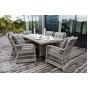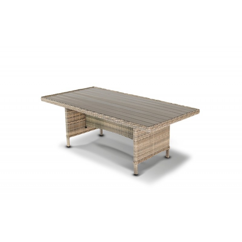 Каркас изготовлен из алюминия, декорированного долговечным искусственным ротангом комбинированного плетения – круглого и плоского. Стол выполнен в натуральном серо-соломенном оттенке, имитирующем цвет натуральной лозы. Столешница произведена из универсального полимерного материала ДПК, устойчивого к переменам погоды.