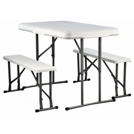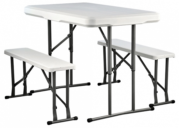 Складной набор для пикника: стол и две лавочки. Все складывается в один стол. Цвет: белый (гранит). Толщина столешницы 3.5 см. Размер в сложенном состоянии 64х107х9 см. Труба Ø25х0.8 мм.Характеристики..