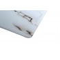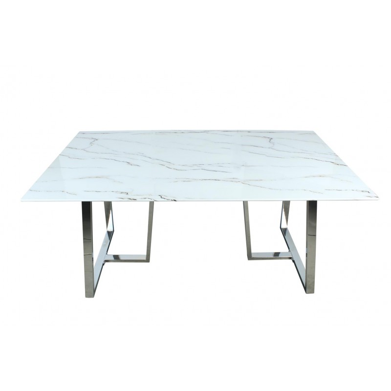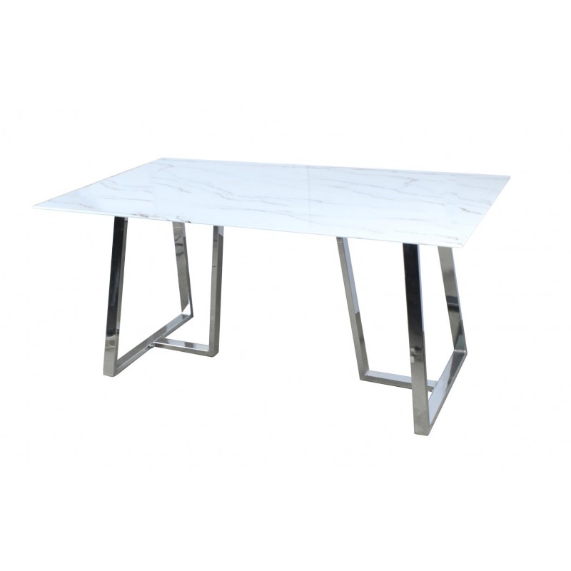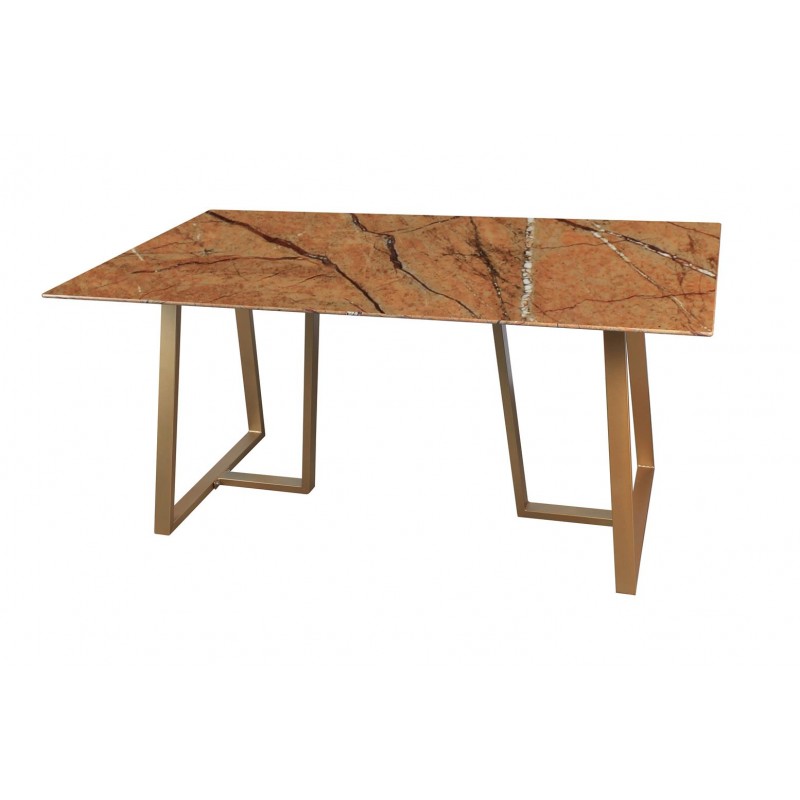 Обеденный стол с красивой стеклянной столешницей насыщенного цвета с рисунком под мрамор.