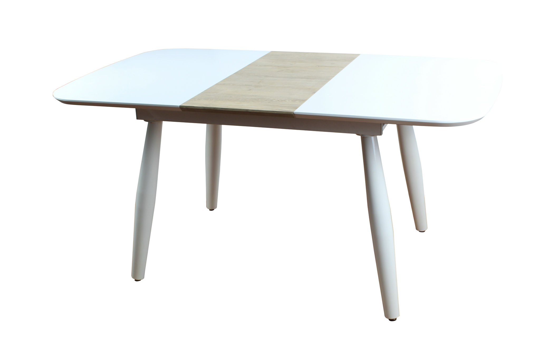 Обеденный стол в прямоугольной столешницей. Цвет столешницы белый. Ножки металлические, покрашены в цвет светлого дерева.Подходит для большой компании, дополнительно раскладывается на 60 см.Характерис..