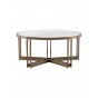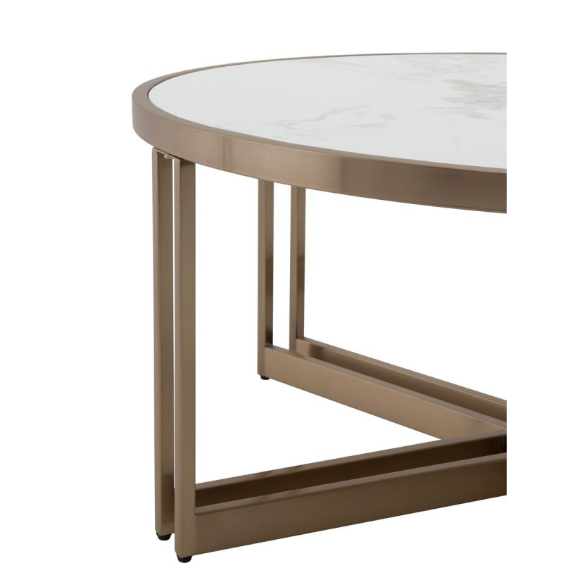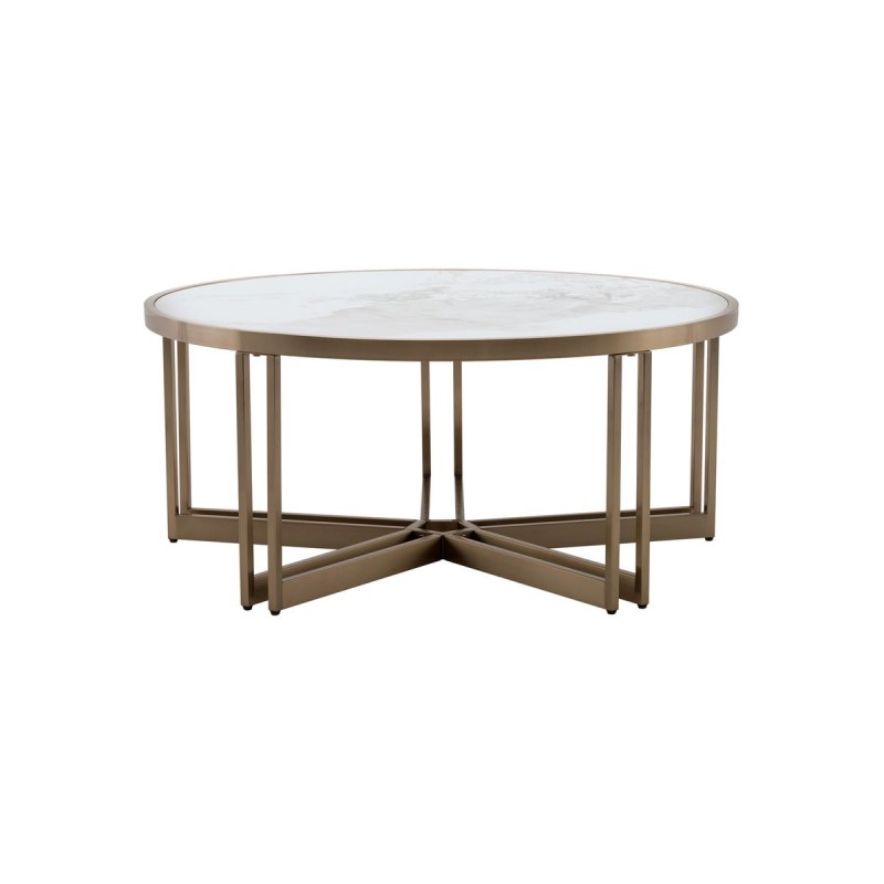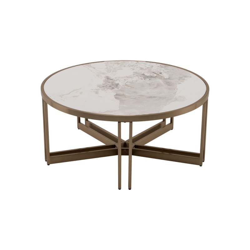 Журнальный столик Алиада станет ярким акцентом в интерьере гостиной, спальни или зоны отдыха. Его круглая столешница из спеченного камня в светлой керамической отделке создает утончённый образ, а металлическое основание цвета шампань придает композиции изысканность и визуальную лёгкость. Столешница выполнена из спеченного камня прочного, устойчивого к царапинам и влаге материала, имитирующего мрамор. Каркас изготовлен из прочной стали с матовым металлическим блеском, устойчивой к коррозии и деформации. Столик устойчив, не занимает много места и подходит как для центральной зоны, так и для размещения сбоку от дивана. Размеры: 90×90×40 см. Максимальная нагрузка: 25 кг