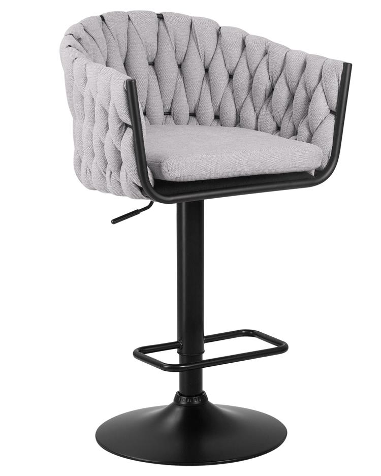 Стильная и минималистичная модель барного стула прекрасно дополнит интерьер домашней кухни, бара или кафе. Сиденье выполнено из рогожки в светло-сером цвете, не требует особого ухода и легко очищается..
