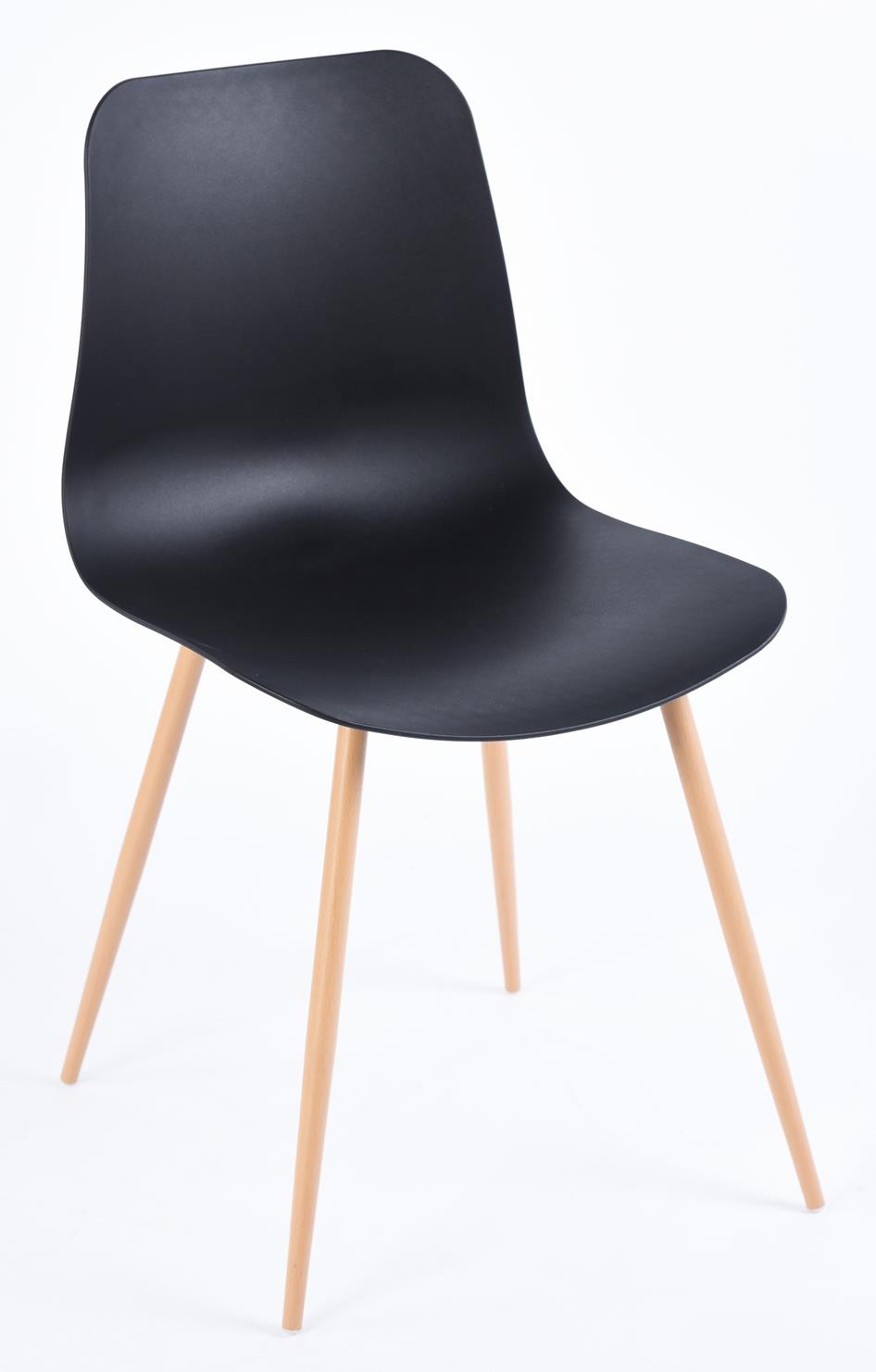 Сидение и спинка выполнены из прочного пластика черного цвета. Металлические ножки с принтом бук.