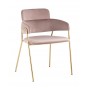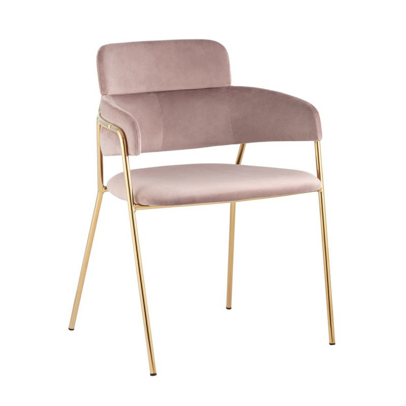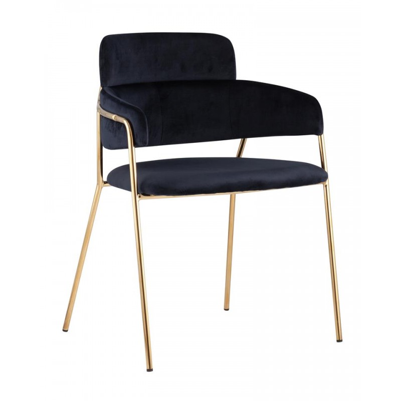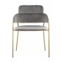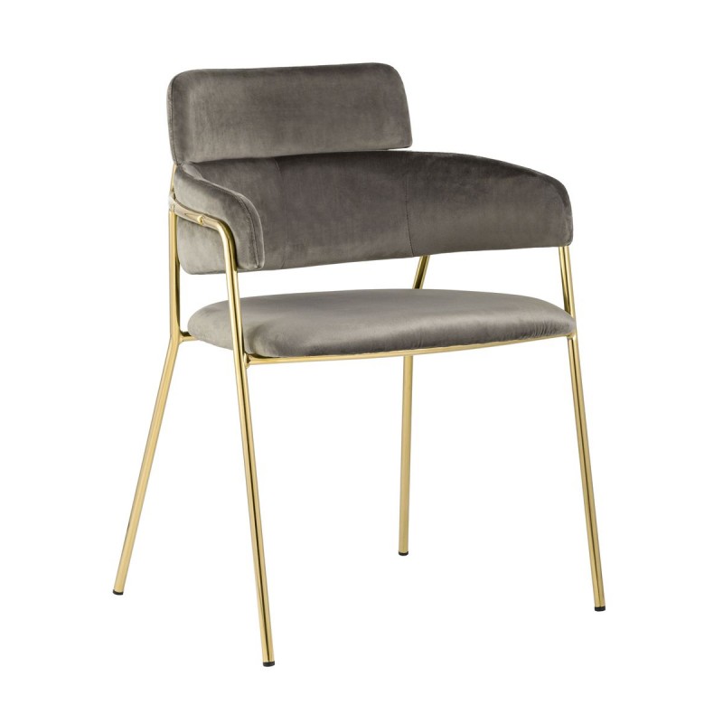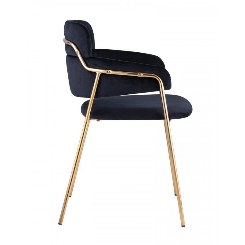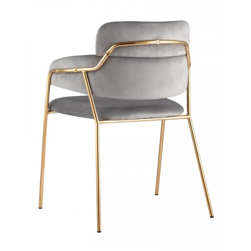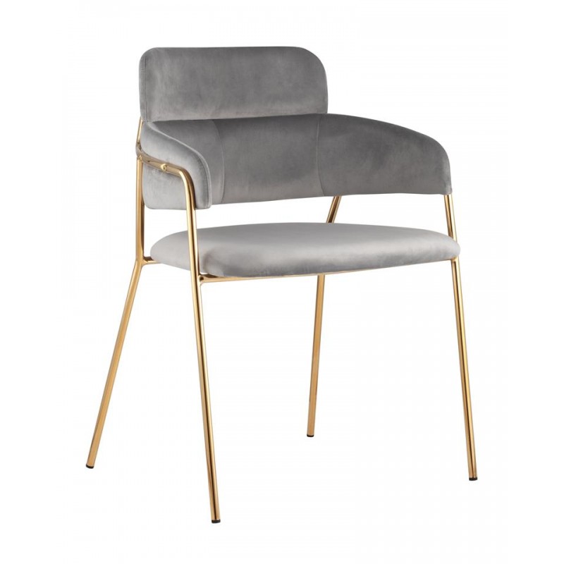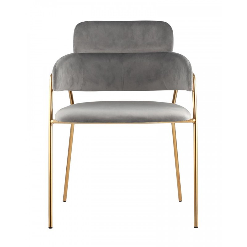 Стильный стул с оригинальной спинкой и подлокотниками. В качестве обивки используется мягкий вельвет. Металлический каркас золотого цвета огибает спинку и выступает аккуратным акцентом модели. Широкое сиденье обеспечивает удобную посадку.