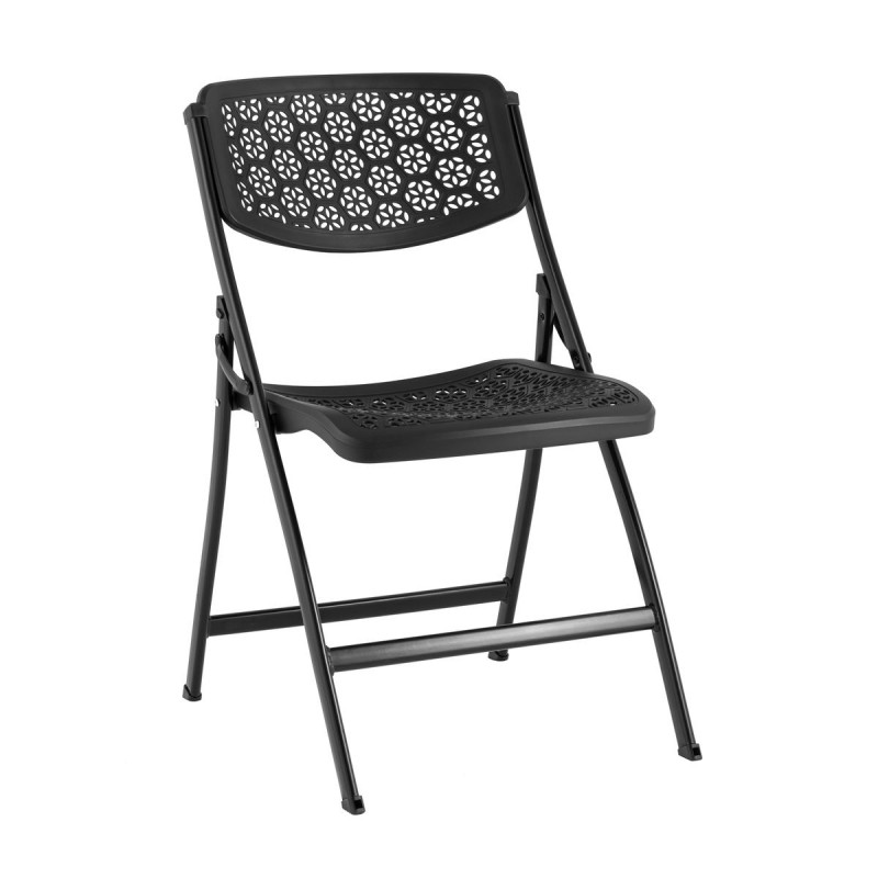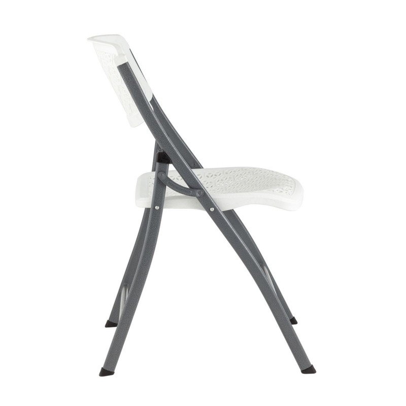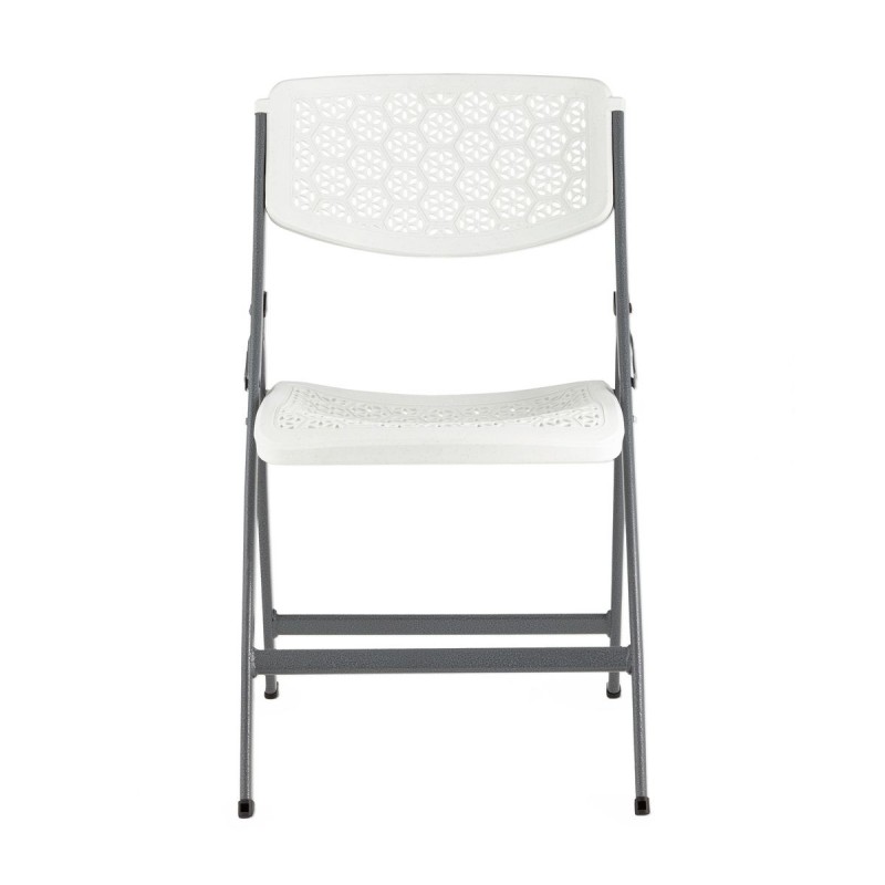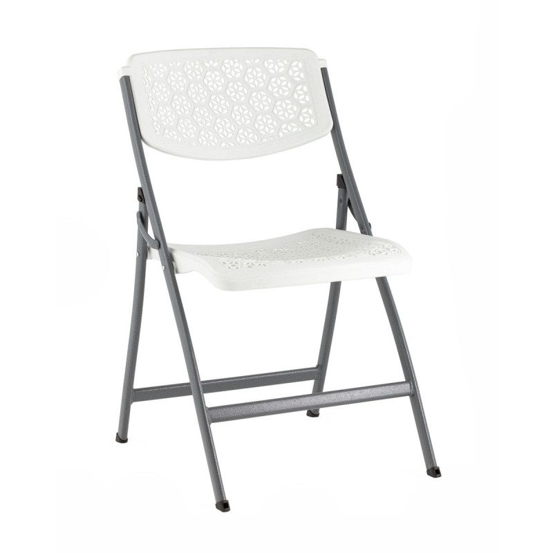 Стильный складной пластиковый стул COMB - сочетает в себе прочность, стиль и комфорт. Очень мобильный и легкий, в сложенном виде занимает мало место, что делает его хранение более удобным. Сиденье и спинка изготовлены из высокопрочного пластика, выдерживающий высокие нагрузки и не трескается при ударной нагрузке. Усиленный металлический каркас обеспечивает устойчивость и долговечность, выдерживает нагрузку до 150 кг. Стул легко складывается, что позволяет экономить место при хранении. Стул имеет современный стиль и лаконичный белый цвет, что делает его универсальным для любого интерьера. Узор на сиденье и спинке стула выполнен в виде множества маленьких круговых отверстий, образующих цветочные мотивы, которые добавляют элегантности и выполняют функцию вентиляции. Модель обладает широкой спинкой и удобной посадкой, что гарантирует комфорт даже при длительном сидении. Идеально подходит для небольших кухонь, сада, кейтеринга, выездных мероприятий и банкетов.